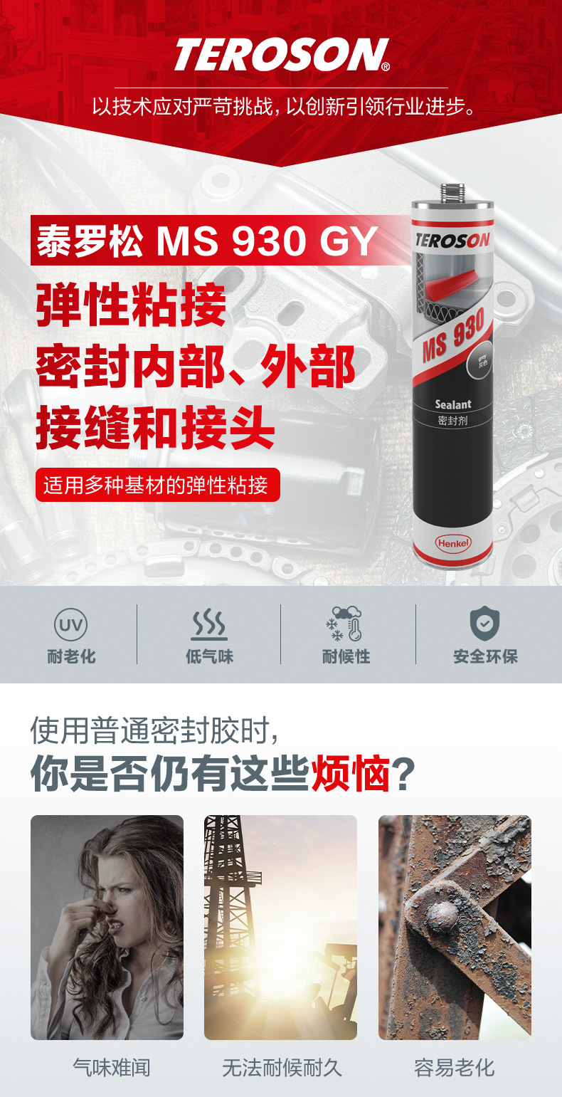 泰羅松MS930是一款單組份、多用途、濕氣固化的觸變型改性硅烷密封膠/粘合劑。它常見(jiàn)顏色有白色、灰色和黑色,適合涉及多種基材的不同應(yīng)用。該密封膠以MS聚合物為基材,與空氣中的水分反應(yīng)生成柔軟的彈性體,具有良好的密封和粘接性能。